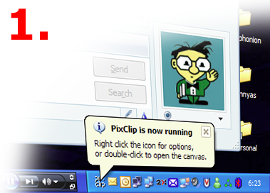 1. Double click PixClip's icon in the systray to open the canvas. You can also use the the context menu (right click PixClip's icon and select "Show canvas"), or use a keyboard shortcut (configurable in the options form).
